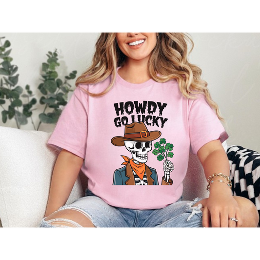 Howdy Go Lucky Skeleton Shamrock Short Sleeve Tee | St Patrick’s Day Tshirt